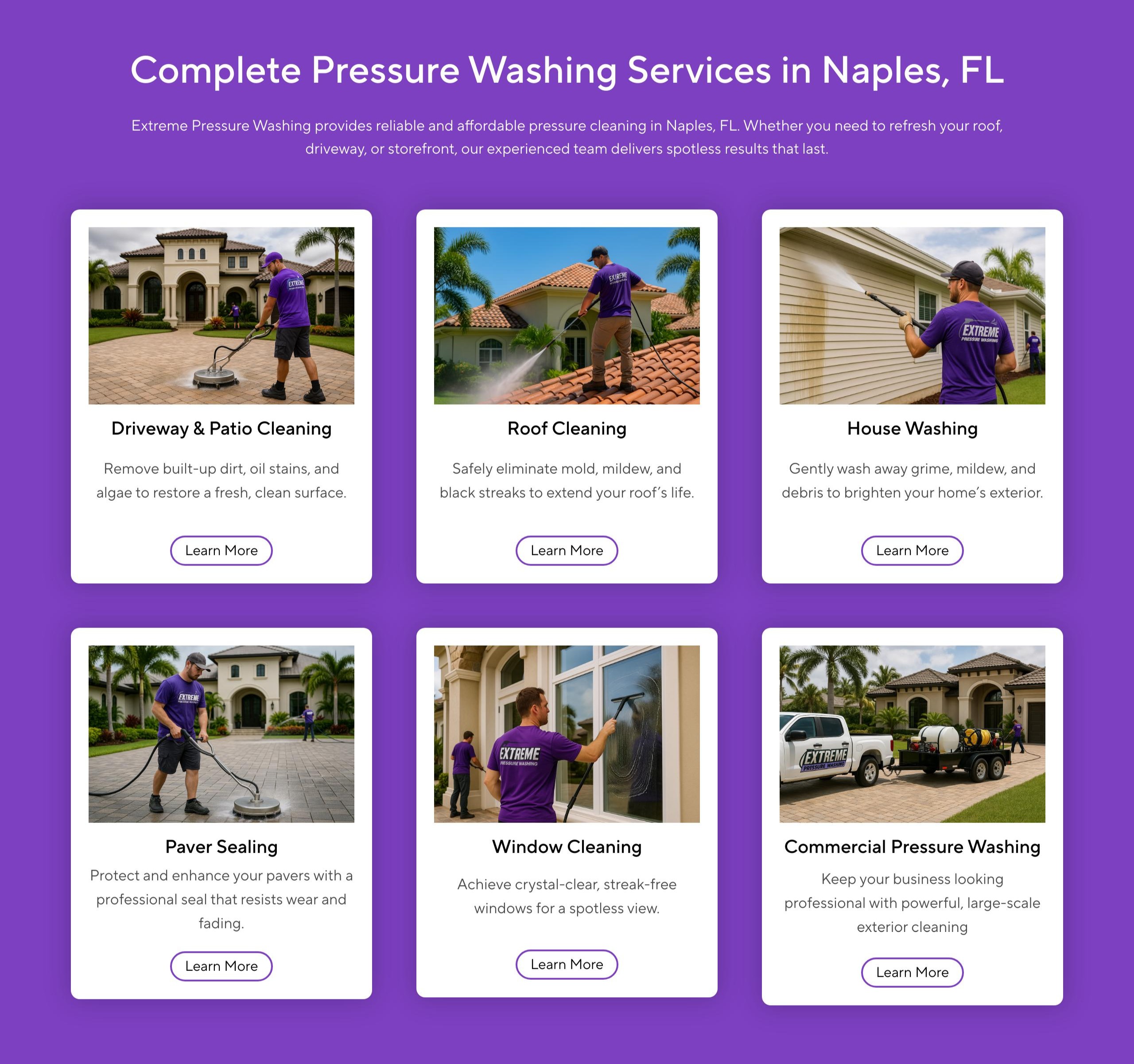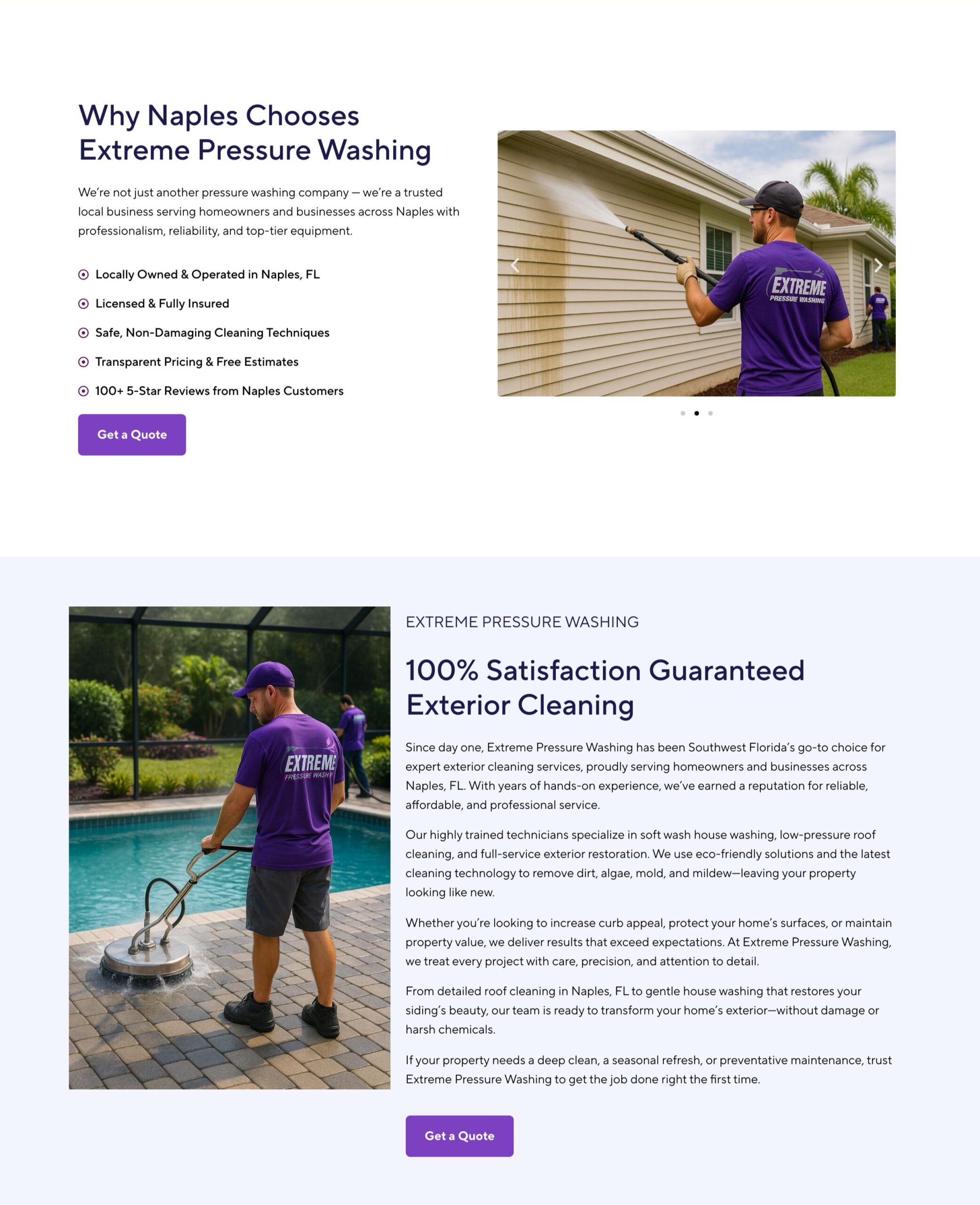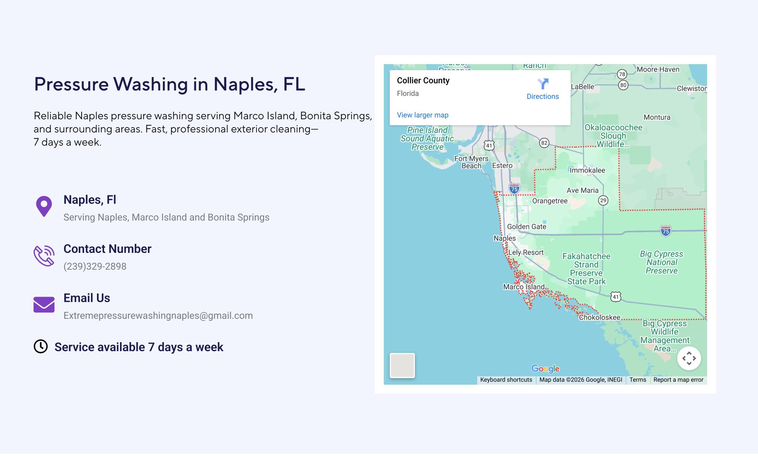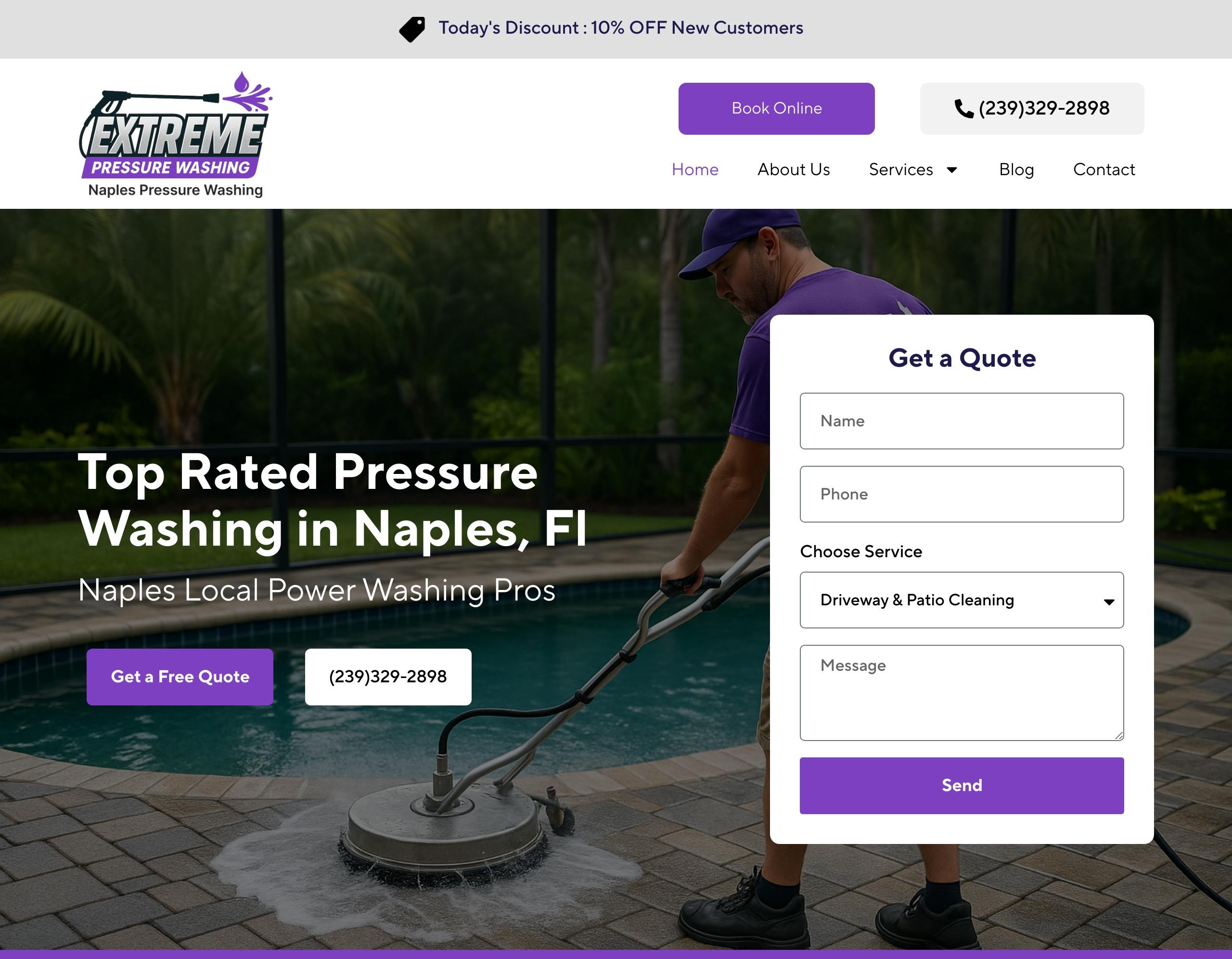 We designed a clean, professional, and mobile-optimized website for Extreme Pressure Washing Naples to help local customers easily find their pressure washing, exterior cleaning, and surface restoration services. The layout emphasizes fast navigation, clear service highlights, and simple contact options for users ready to book cleaning services.